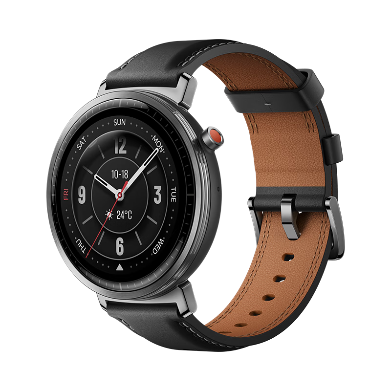 手表机身薄至 9.9mm、轻至 26g,采用铝合金表圈、真皮表带。通过创新堆叠,搭载了 495mAh 大容量硅碳负极电池。充电一次,蓝牙续航可达 23 天、开启 AOD 也能拥有 9 天的续航时间。