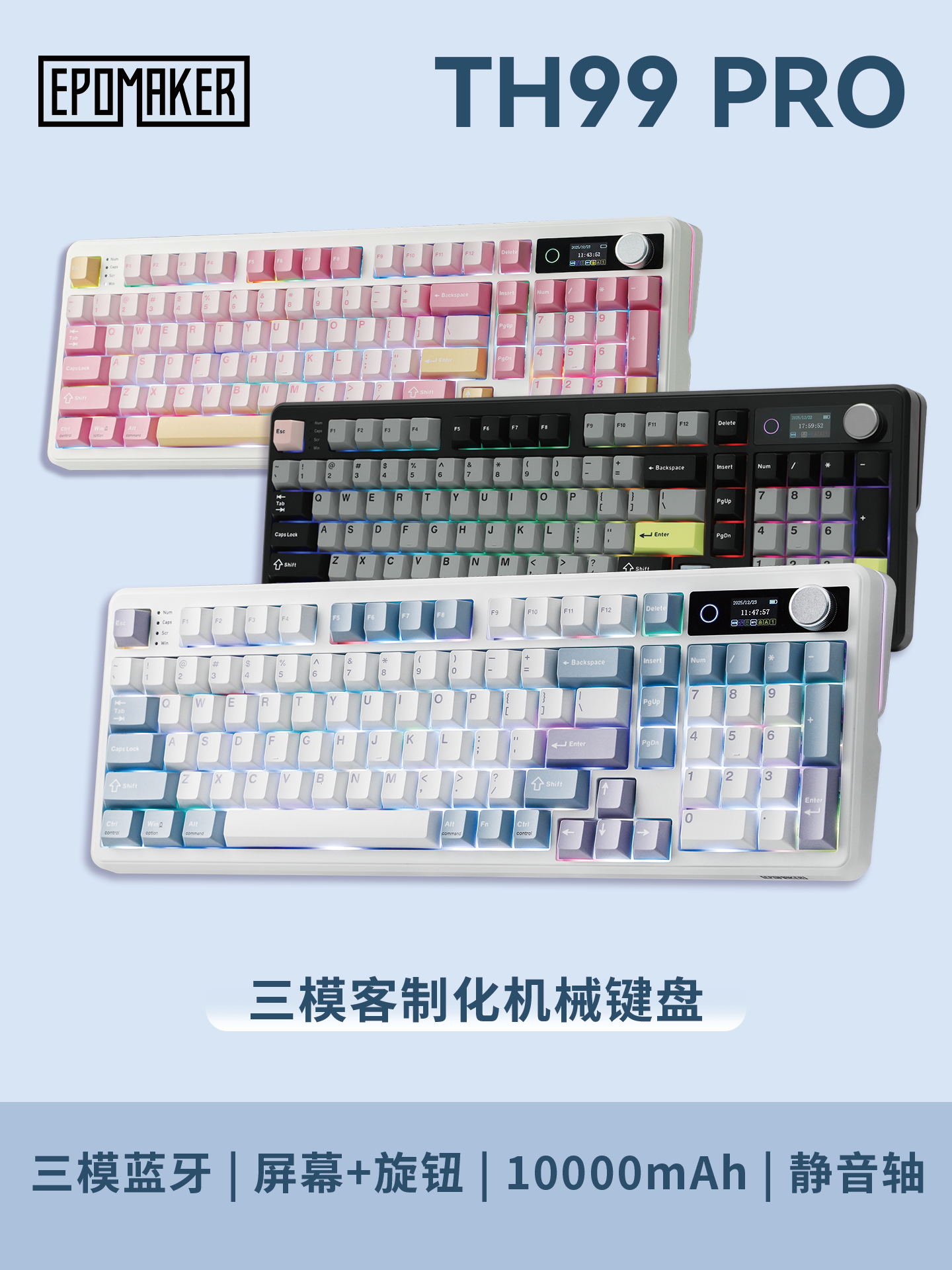 IT之家 1 月 19 日消息,EPOMAKER 上周五上线了 TH99 PRO 三模机械键盘。这一键盘采用 95% "1800" 配列,数字键区的 "0" 键占据 2 个键位(IT之家注:即所谓 "2U0" 设计),右上角配备音量旋钮和 1.06" TFT LCD 可自定义屏幕。